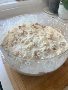 מערבבים בעדינות בקערה את הלחם, השמנת, הביצים והסוכר עד לקבלת תערובת לחה מאוד, אבל שהלחם לא יתפרק לחלוטין.