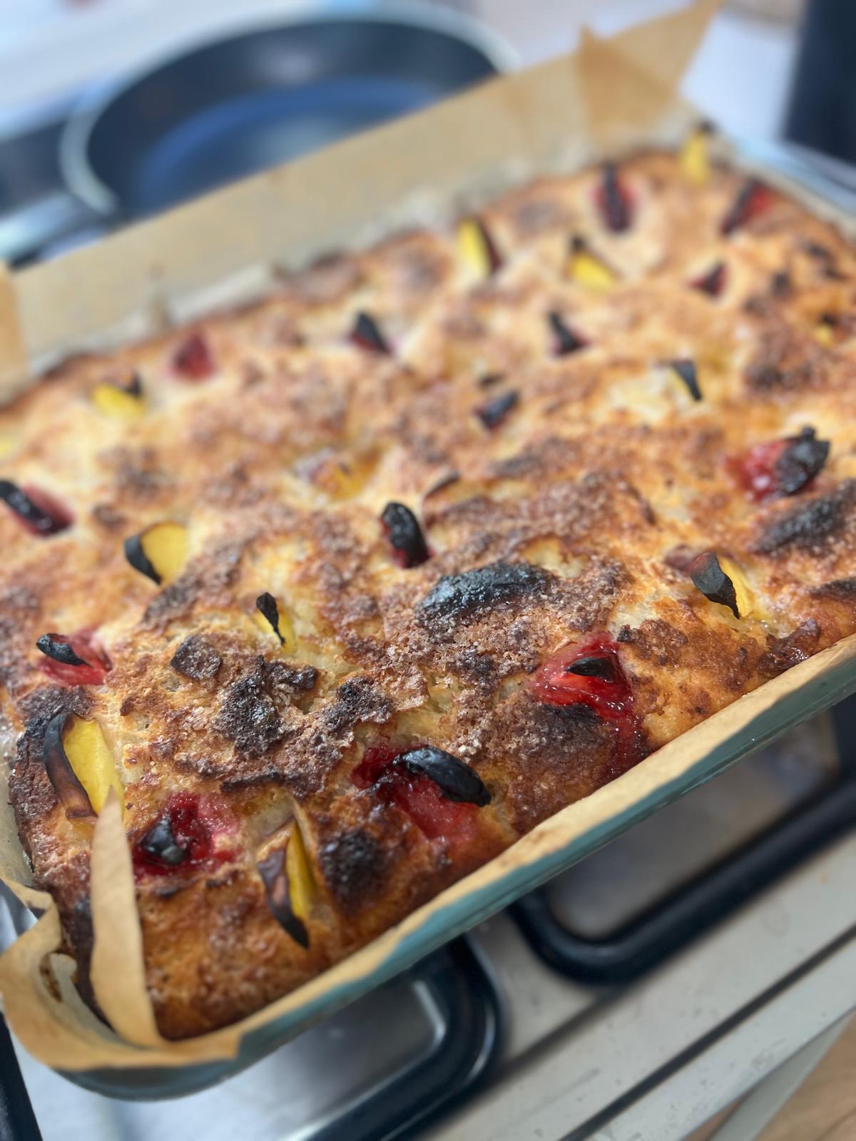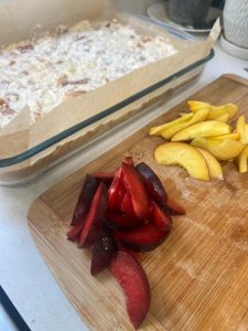 מעבירים לתבנית עם נייר אפייה ומפזרים מלמעלה את הפירות החתוכים, את החמאה ואת הסוכר החום שנותר.