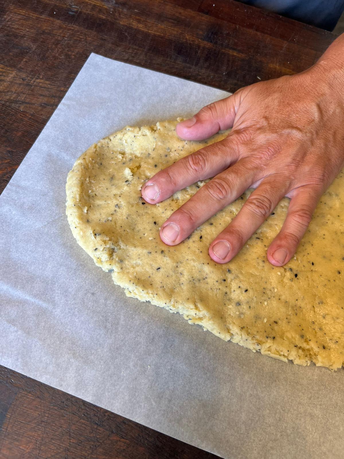 עוברים על הקווים שחרצנו קודם בשביל לשחרר את העוגיות ומחכים שיתקררו בשביל להפריד מנייר האפייה.