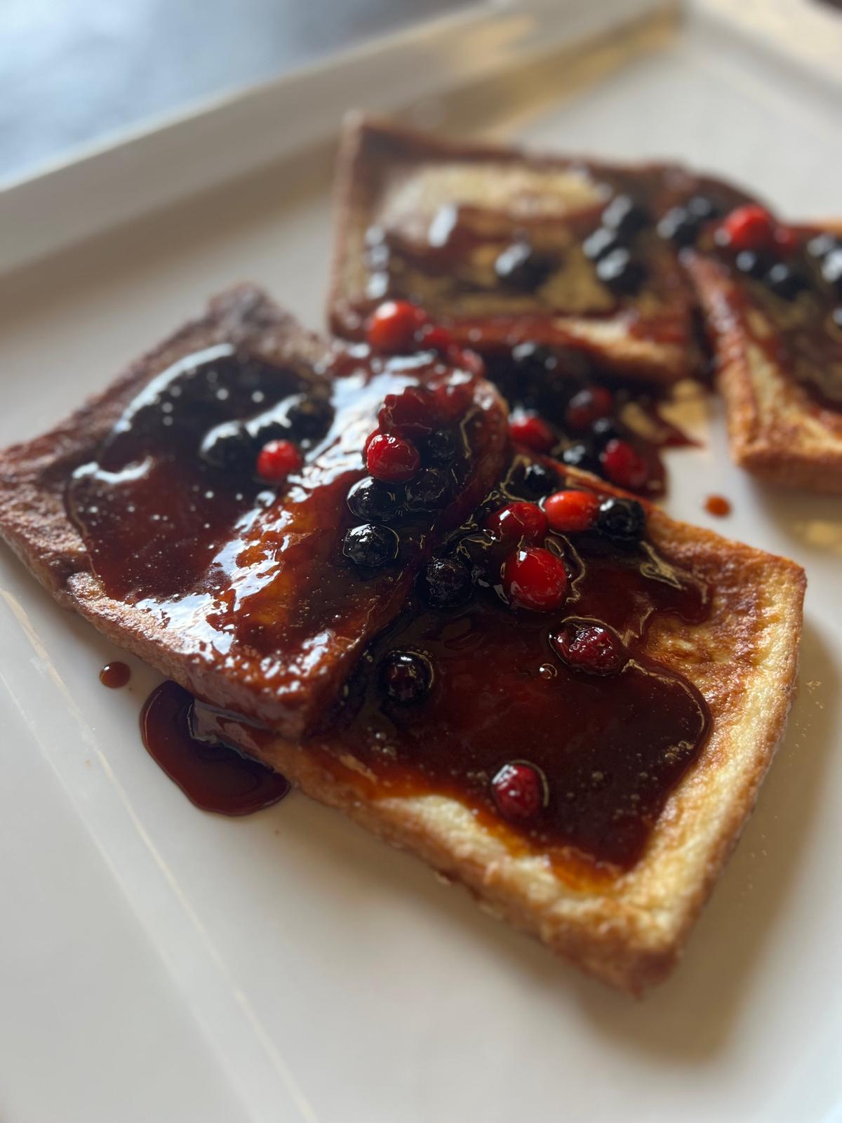מחממים במחבת סוכר וכשהוא מתקרמל מוסיפים קוביית חמאה ואת פירות היער ומערבבים. כשהחמאה נמסה יוצקים מעל הפרנצ'טוסט.